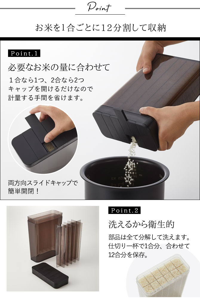 お米が1合ごとに12分割されているから、必要な分のお米を直接おかまに注ぐだけ! 冷蔵庫のドアポケットや野菜室にも収納できます。